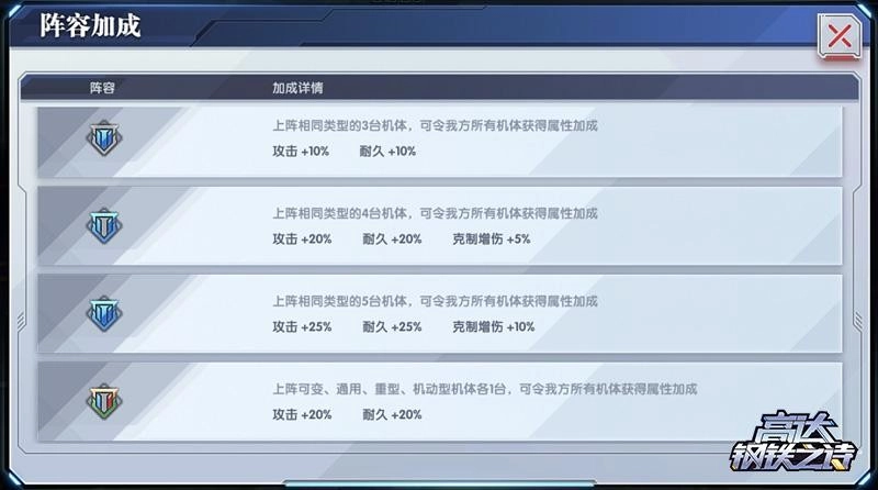 除了克制关系外,机体类型还会影响我们在编队时获得的阵容加成。上阵3台、4台、5台同类型机体时,所有机体将分别获得攻击和耐久的加成;上阵4台及以上同类型机体时,还可以获得额外的5%和10%克制增伤。