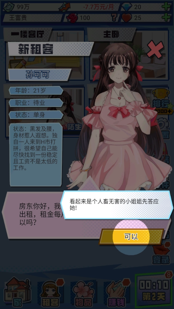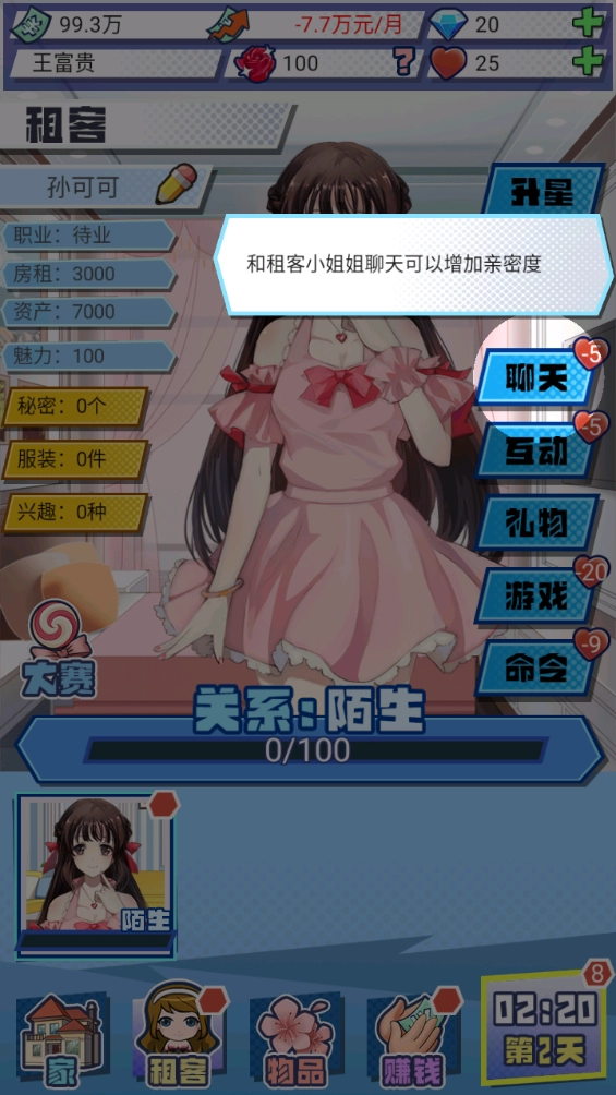 Q版风格的竖画透着满满的萌感,各类业务任务都能高效完成。房租之类的开销完全不用担心。要是你实在应付不来,就去找你父亲帮忙。在外地打拼时,我结识了一位很可爱的女朋友,如今我们正一起合租。现在轮到你承担起赚钱养家的责任了。通过玩各种有趣的游戏能增进彼此的亲密度,让你尽情体验最甜蜜的恋爱时光,最终彻底打动你的女朋友,让她成为你的终身伴侣。