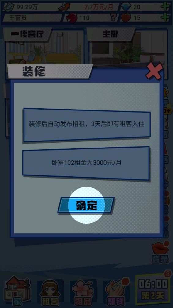4、获得资金后可以装修更多的房间