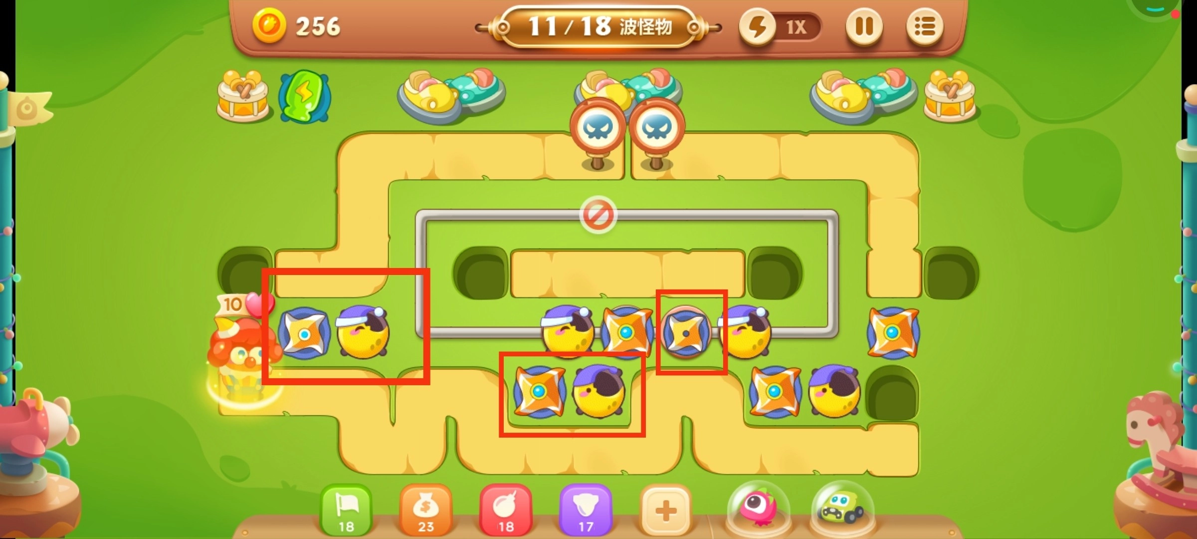 ② 下图为第6波开始时的炮塔位置(新增炮塔已用红框标注,下同):
