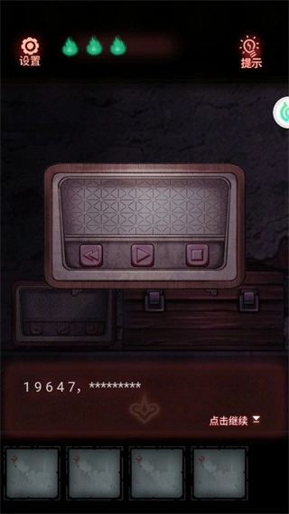 9、按顺序点击收音机的按钮【中、右、中、左】,得到密码【19647】。(注意听完每条语音再点按钮,最后的密码语音也要听完,不要关闭游戏或者手机的声音)。