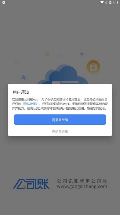 用户须知:欢迎使用公司账户。为保障您的隐私安全及使用体验,请务必仔细阅读我们的《隐私政策》。我们会获取您的IMEI、手机标识等信息,以提供基础的反作弊服务。请在充分理解并同意后再使用本应用,感谢您的配合。同意并继续,拒绝并退出。请点击“同意并继续”!!!