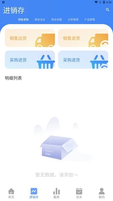 首页下方设有多个不同板块的服务页面,例如进销存页面就包含销售出货、销售退货、采购进货、采购退货等功能模块。