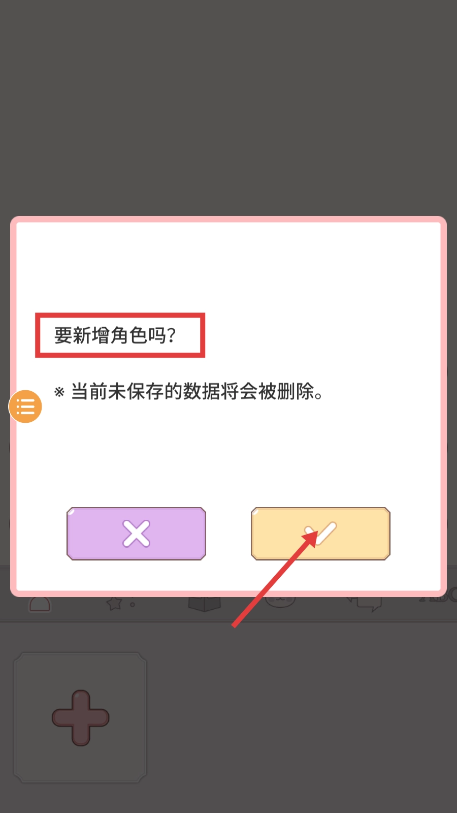 1、若要新增角色,点击【要新增角色吗?】弹窗里的黄色对勾按钮,需注意当前未保存数据会被删除。