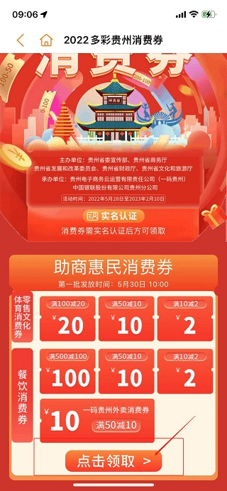 第四步:在领券页面,选择您想要的消费券种类和面额,点击每种券下方的“点击领取”。