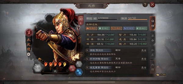 太史慈:太史慈自不必多说,折冲御侮+兵无常势是太史慈的好伙伴,兵书则会选择作战+蛮勇非勇+胜战+分险。