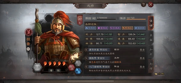 程普:程普十分优秀的地方在于自带战法不受属性影响,这也意味着他战法的能够根据不同情况来选择。如可以全统搭配抚辑军民+锦帆军。或者全智带暂避其锋/八门金锁阵+无当飞军皆可。当然你也可以带嘲讽战法来搭配程普的自带战法打控制。兵书通常选择军形+无战而胜+铁甲+守势。