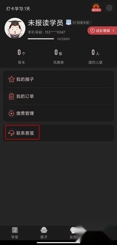 1、进入个人中心页面,选择"联系客服"功能入口。