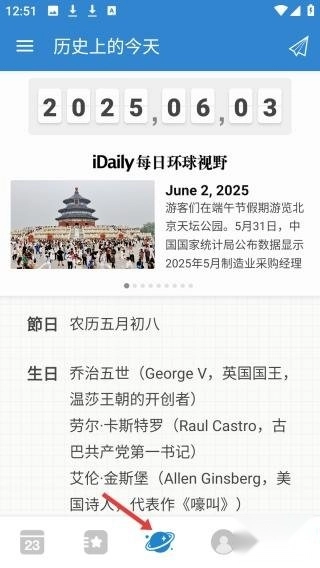 3、点击“历史上的今天”板块,即可查看著名历史事件等内容。