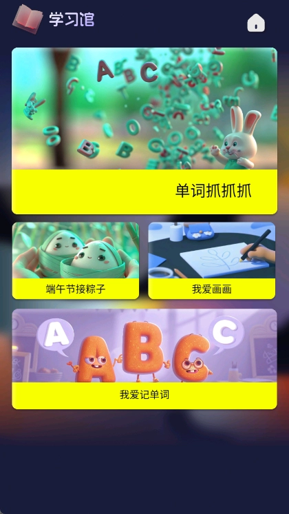 3、在学习馆中可以体验单词抓抓抓、端午节接粽子、我爱画画以及我爱记单词。